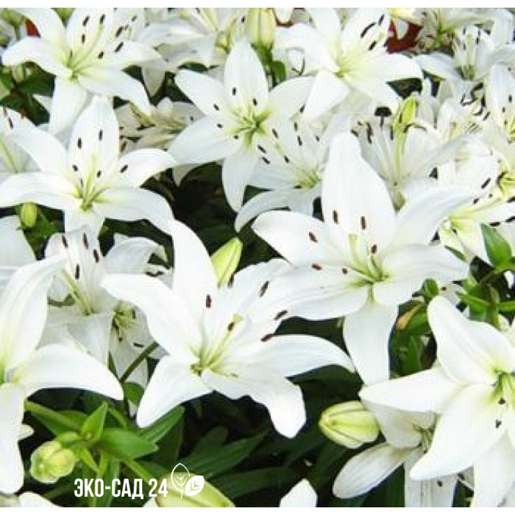 Лилии восточная Касабланка (Lilium Oriental Hybrid Casa Blanca) – это классический пример королевских лилий. Высота стебля до 120 см, стебли прочные, листья темно-зеленые удлиненные. Цветки крупные, до 25 см в диаметре, с волнистыми широкими лепестками загибающимися от центра цветка. Белоснежные классической формы лилии с легкой зеленью у основания лепестка, без крапа, шелковистой фактуры. Очень эффектно выглядят в срезке (в букетах, украшениях помещений, по одному в вазонах), групповых посадках, миксбордерах. Цветут в августе распространяя нежный пряный аромат.